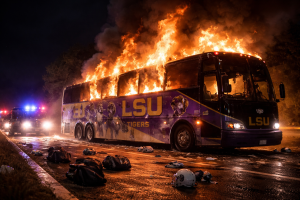 The sports world was shaken late last night after a bus transporting the LSU Tigers football team caught fire under unexpected circumstances. According to preliminary reports, the incident occurred during normal operations when flames suddenly erupted, prompting an immediate emergency response. Fortunately, no players, coaches, or staff members were injured in the incident.